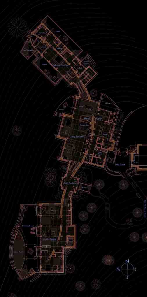 A three-hundred foot long undulating stone wall running through and connecting four pavilions is the unifying concept of this design. As the backbone of the house, it provides niches for art work, separates social from private spaces, echoes the terrain of the site, and in its massiveness represents an ancient architectural element sheltered by a high-tech concrete pier/curved glu-lam beam enclosure system. Approved for construction, the building of the residence and its gate house were unfortunately abandoned just as ground was broken.
